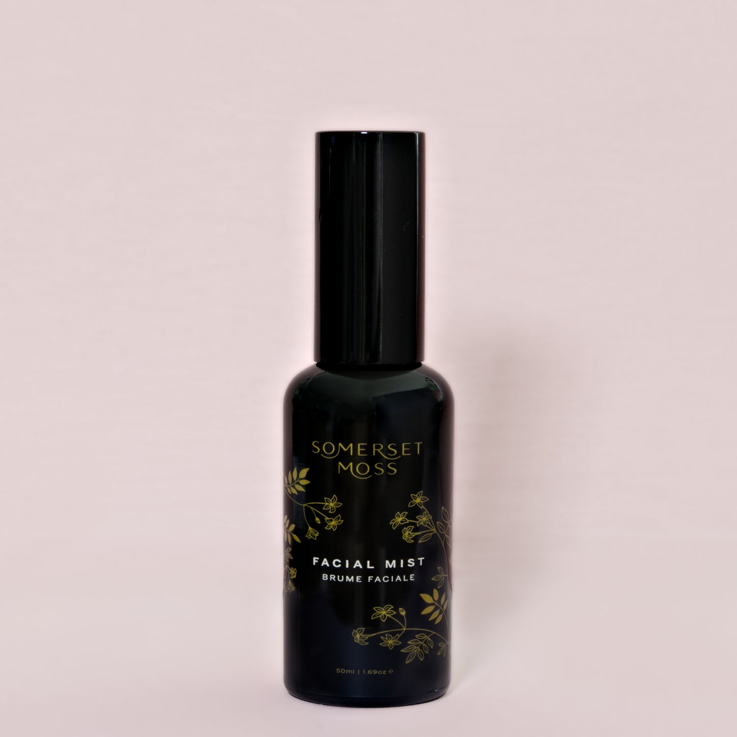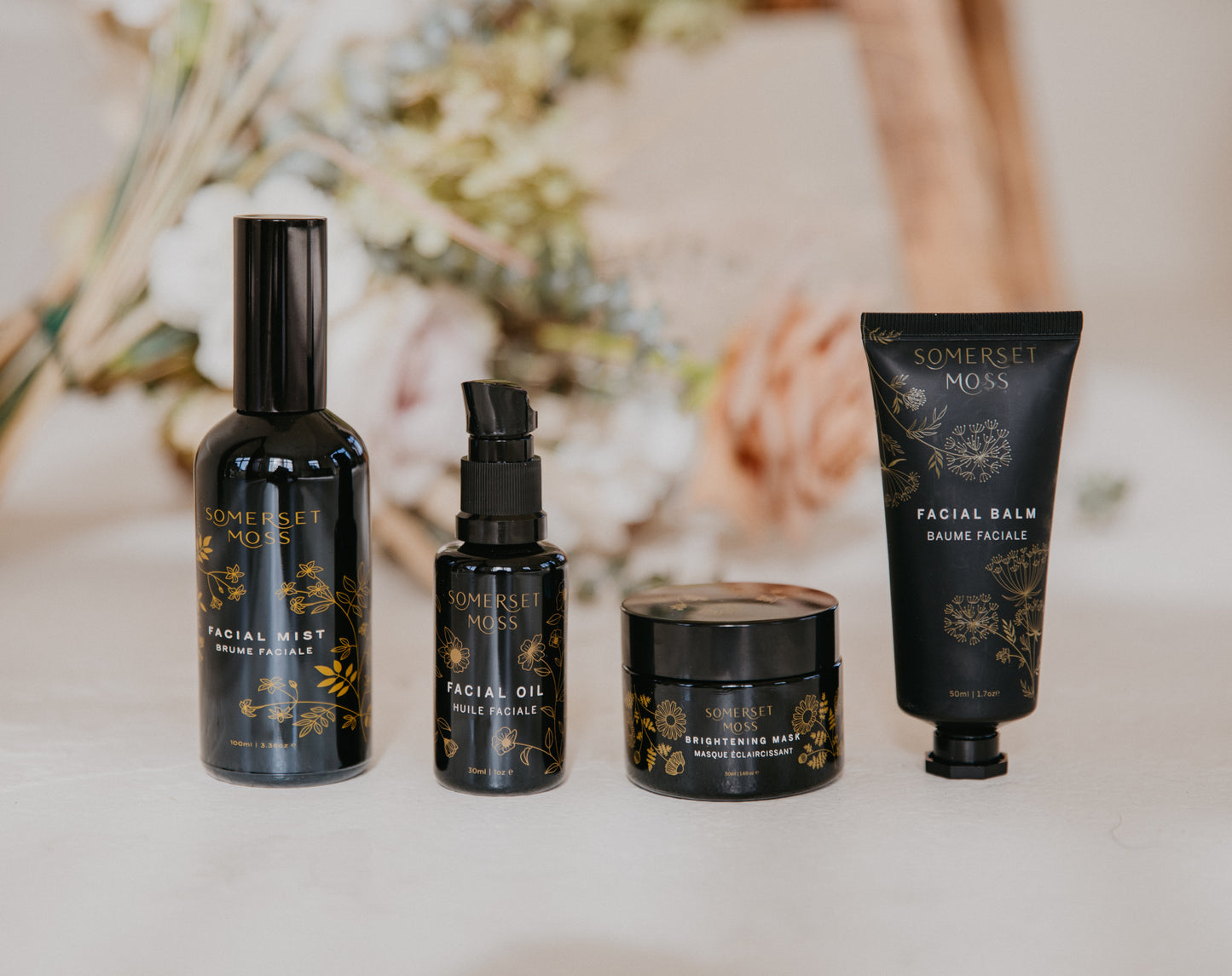 Facial Mist 50ml + Facial Oil 30ml+ Balm 50ml+ Brightening Mask 50ml all in a cute Somerset Moss drawstring bag.